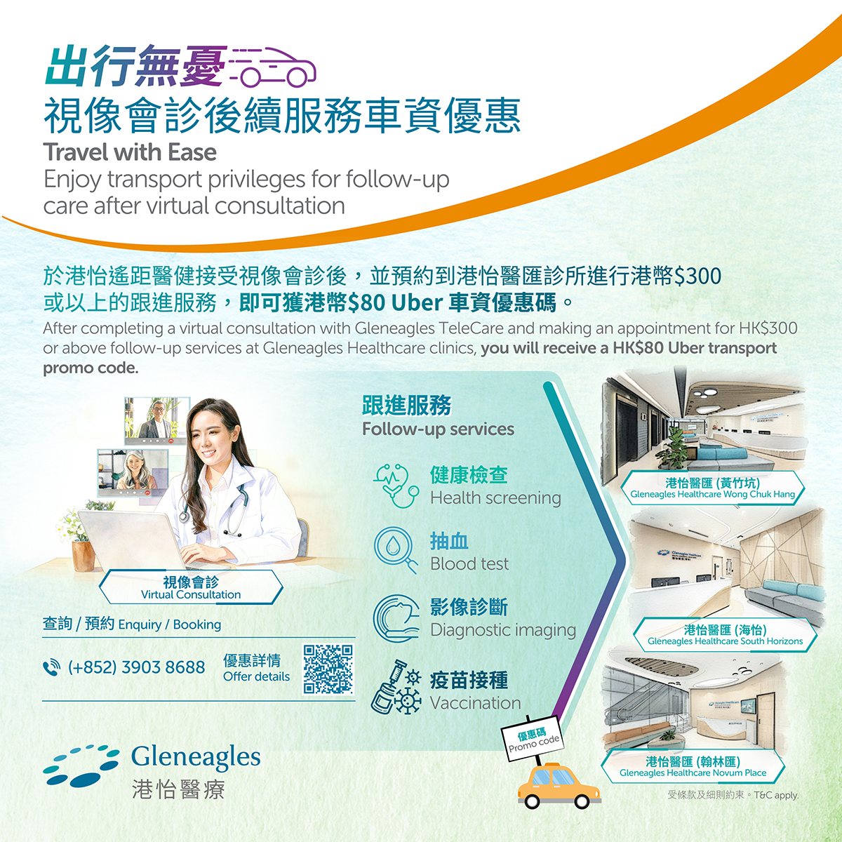 3. Promotion details: during the promotion period, a HK$80 Uber/Uber Taxi promo code will be provided to eligible clients who confirm receiving follow-up services at the Wong Chuk Hang, South Horizons or Novum Place clinic, with a total fee of HK$300 or above, and have the related service fee settled simultaneously via online payment.