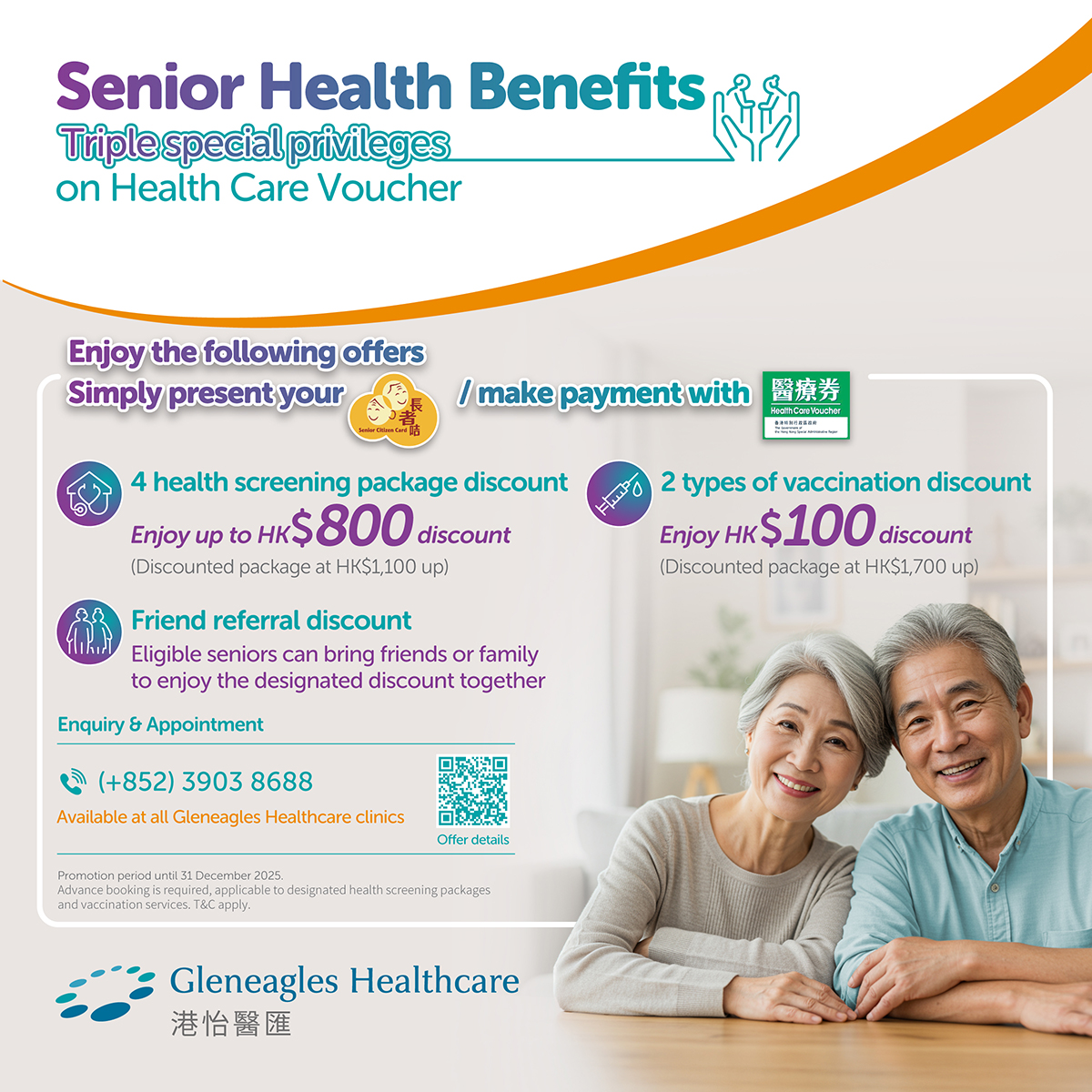 3. By presenting a Senior Citizen Card or using a Health Care Voucher for payment, you can enjoy the following four designated health screening packages and two designated vaccination services at a special discounted price, and subject to the terms and conditions of specific promotion: