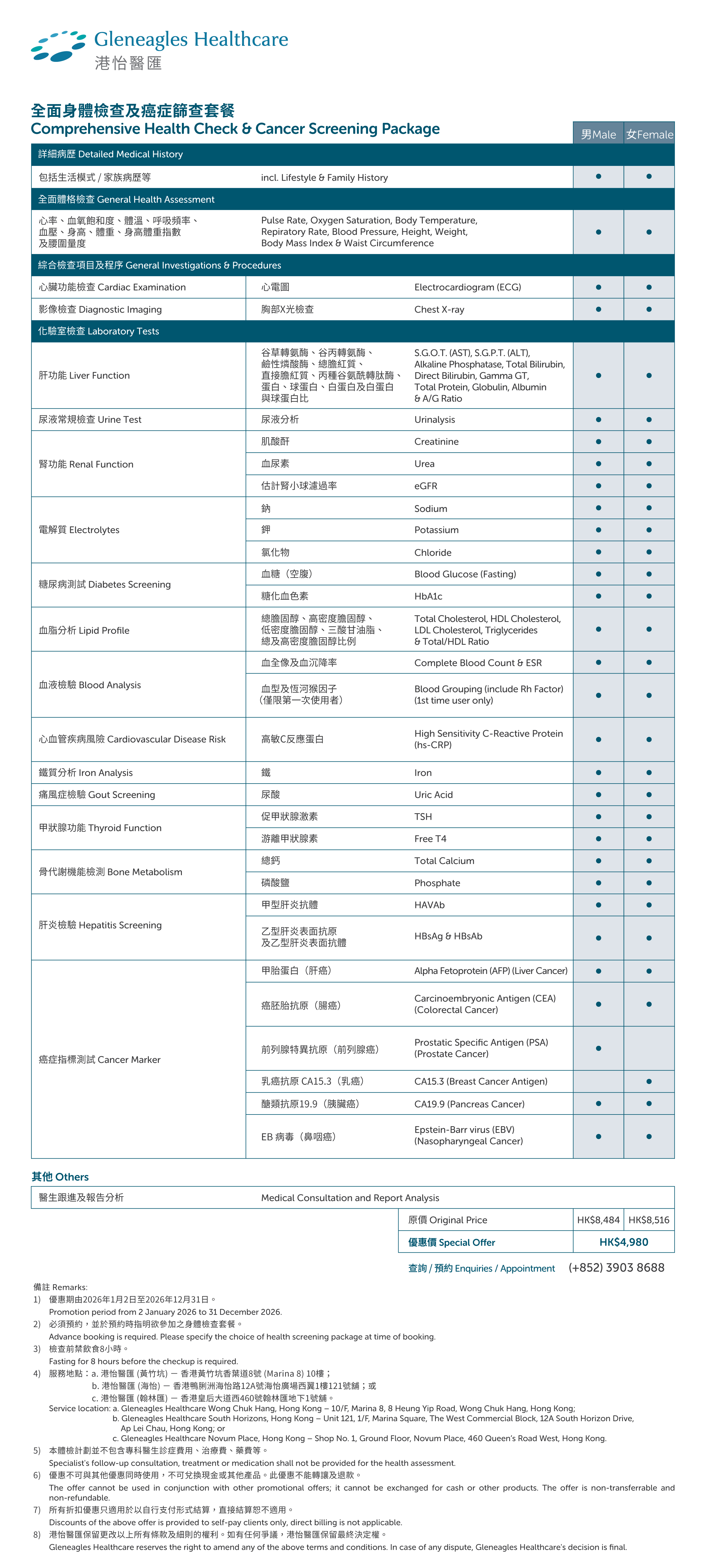 全面身体检查及癌症筛查套餐
