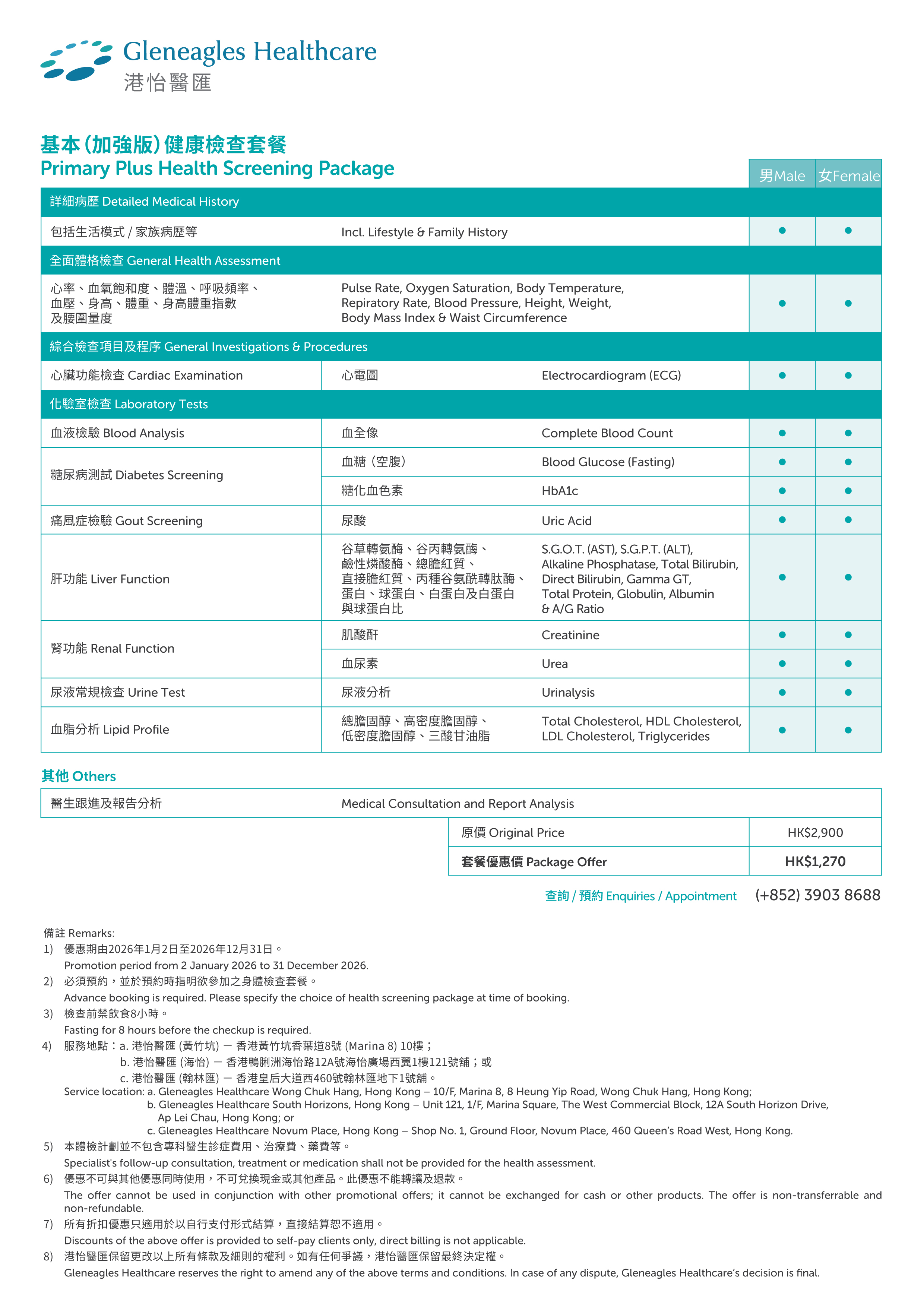 基本(加强版)健康检查套餐(黃竹坑)