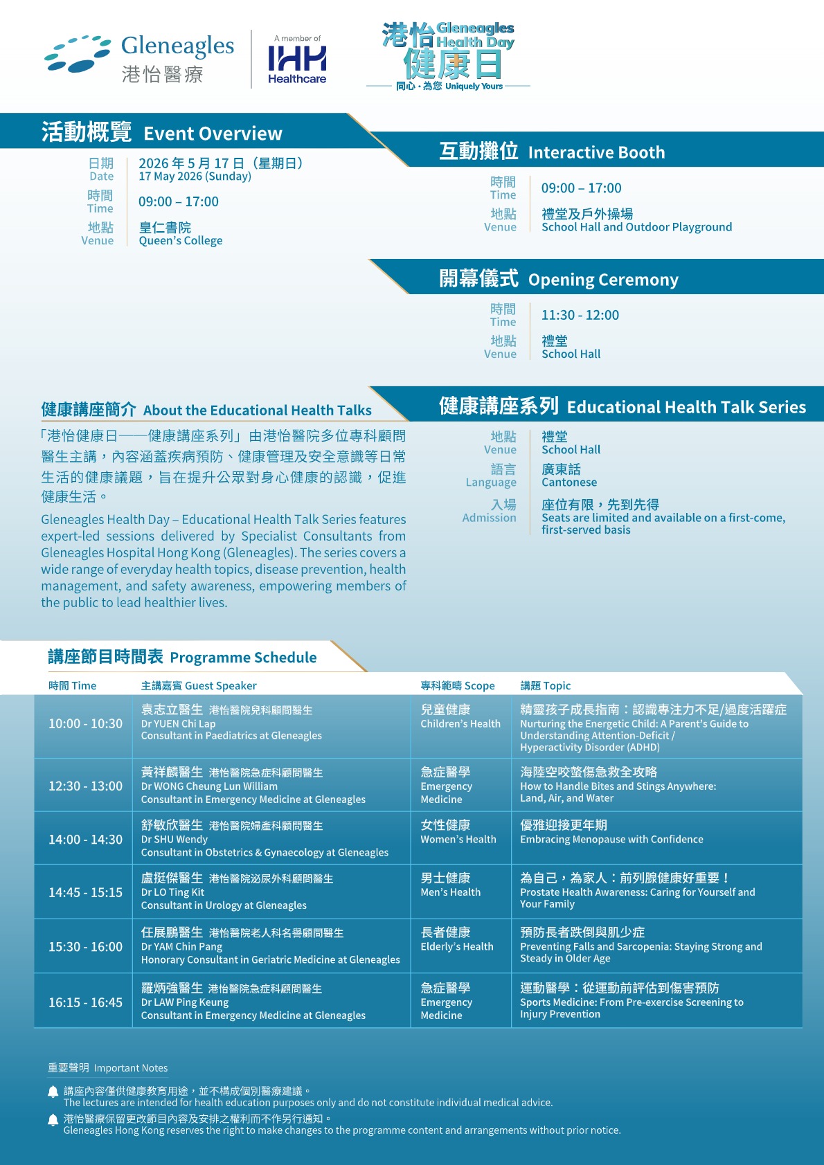活動匯聚港怡急症科及多個專科的醫護團隊,為公眾提供健康評估、專題講座及醫療科技展示,讓市民深入了解現代醫療服務及相關創新技術,並協助不同年齡層的市民建立正確的健康觀念,關注長遠健康需要。